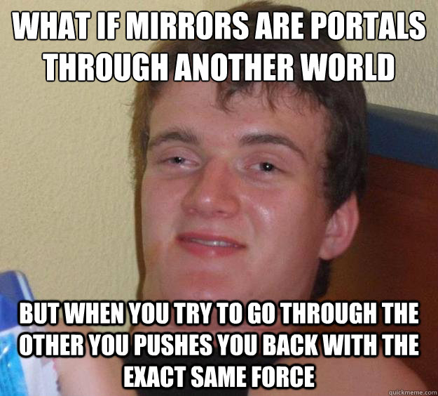 What if mirrors are portals through another world but when you try to go through the other you pushes you back with the exact same force