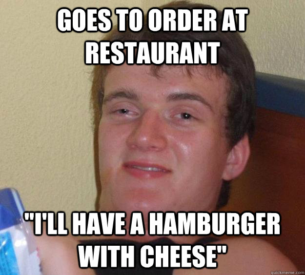 Goes to order at restaurant "I'll have a hamburger with cheese"