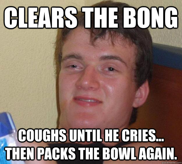 CLEARS THE BONG coughs until he cries... then packs the bowl again.