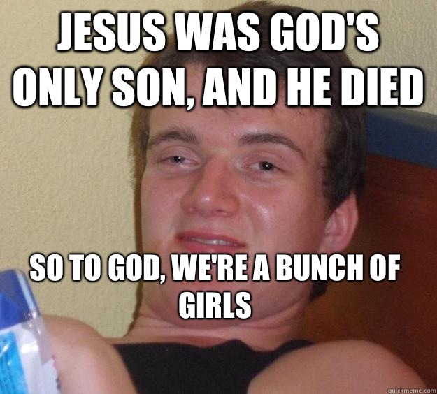 Jesus was god's only son, and he died So to god, we're a bunch of girls