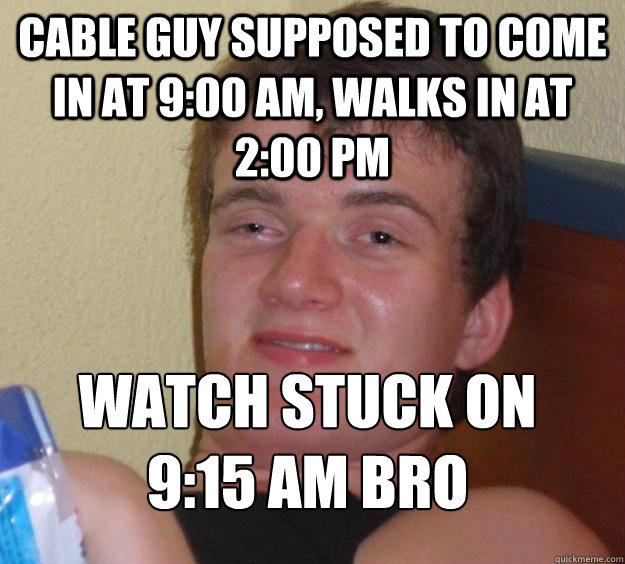 Cable guy supposed to come in at 9:00 am, walks in at 2:00 pm Watch stuck on 9:15 am bro