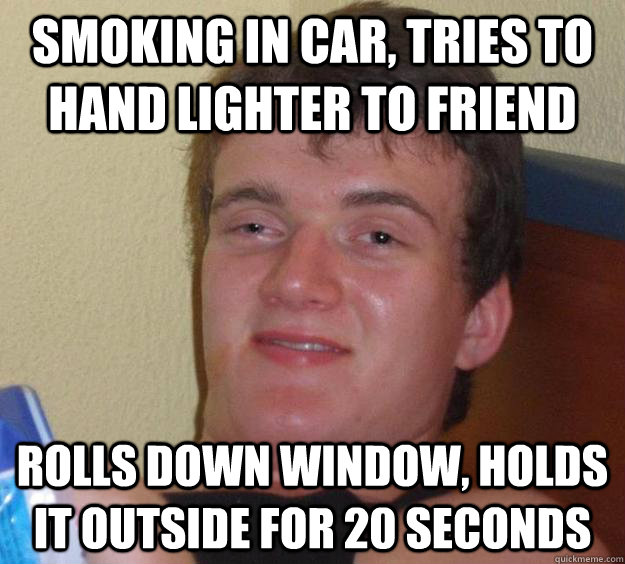 smoking in car, tries to hand lighter to friend rolls down window, holds it outside for 20 seconds