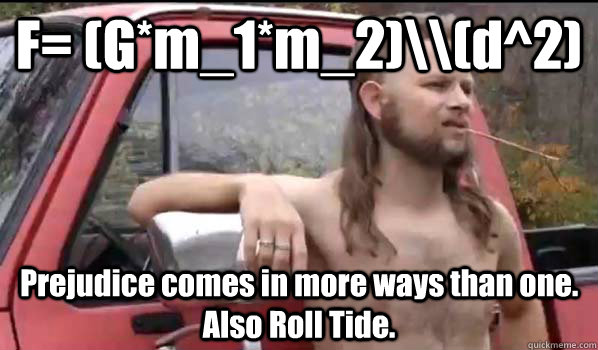 F= (G*m_1*m_2)\\(d^2) Prejudice comes in more ways than one. Also Roll Tide.