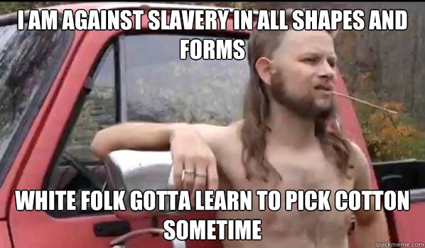 I am against slavery in all shapes and forms white folk gotta learn to pick cotton sometime