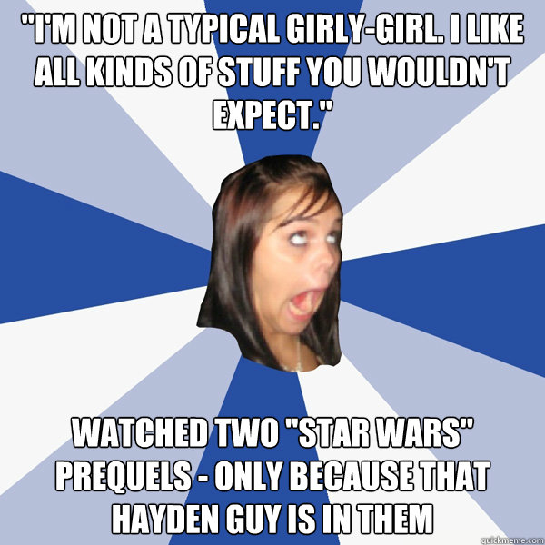 "I'm not a typical girly-girl. I like all kinds of stuff you wouldn't expect." Watched two "Star Wars" prequels - only because that Hayden guy is in them