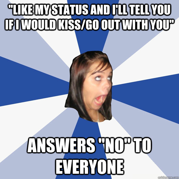 "like my status and i'll tell you if i would kiss/go out with you" answers "no" to everyone