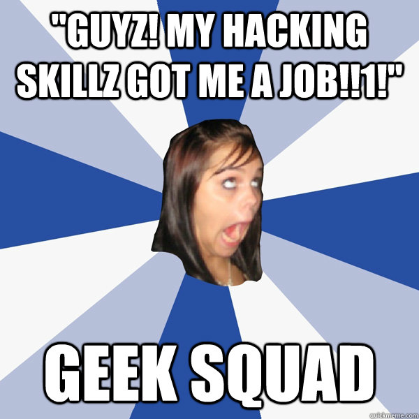 "guyz! my hacking skillz got me a job!!1!" geek squad
