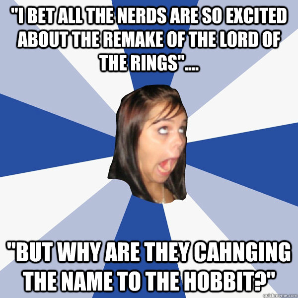 "I bet all the nerds are so excited about the remake of the lord of the rings".... "but why are they cahnging the name to the hobbit?"