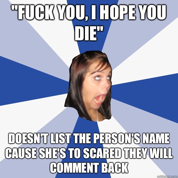 "Fuck you, I hope you die" Doesn't list the person's name cause she's to scared they will comment back