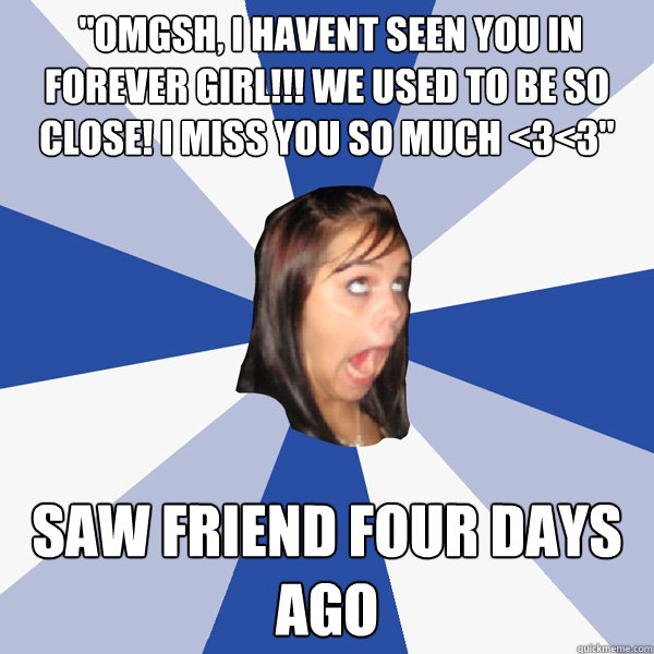 "OMGSH, I Havent seen you in forever girl!!! We used to be so close! I miss you so much <3<3" Saw friend four days ago