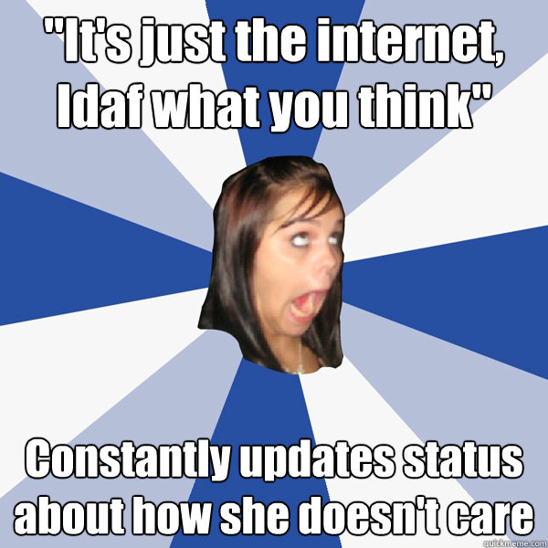 "It's just the internet, Idaf what you think" Constantly updates status about how she doesn't care