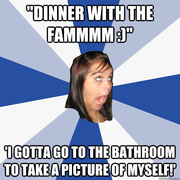 "Dinner with the fammmm :)" 'I gotta go to the bathroom to take a picture of myself!'