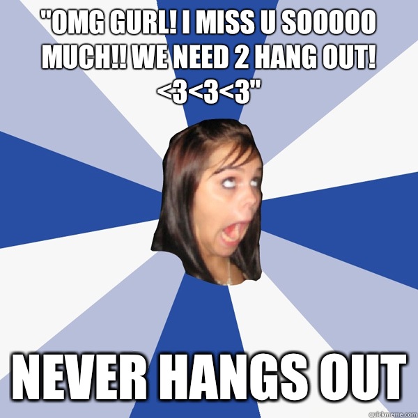 "OMG gurl! I miss u sooooo much!! We need 2 hang out! <3<3<3" Never hangs out