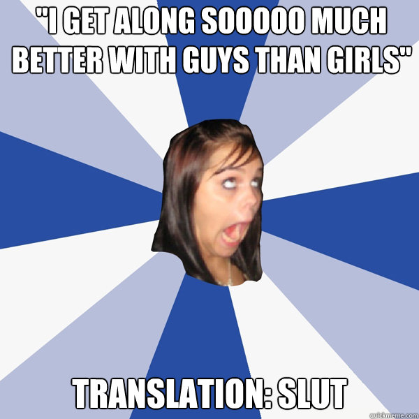 "I get along sooooo much better with guys than girls" Translation: Slut
