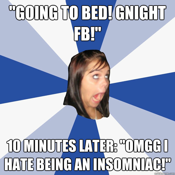"Going to bed! gnight fb!" 10 minutes later: "omgg i hate being an insomniac!"