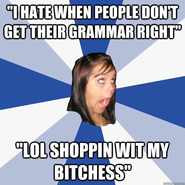 "I hate when people don't get their grammar right" "lol shoppin wit my bitchess"