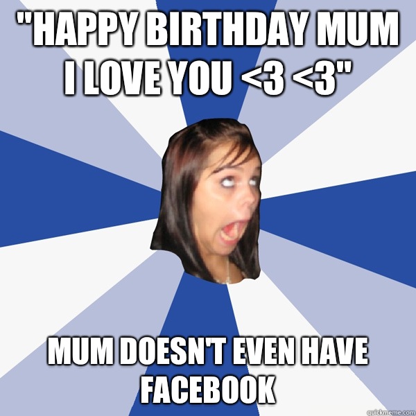 "HAPPY BIRTHDAY MUM I LOVE YOU <3 <3" Mum doesn't even have Facebook