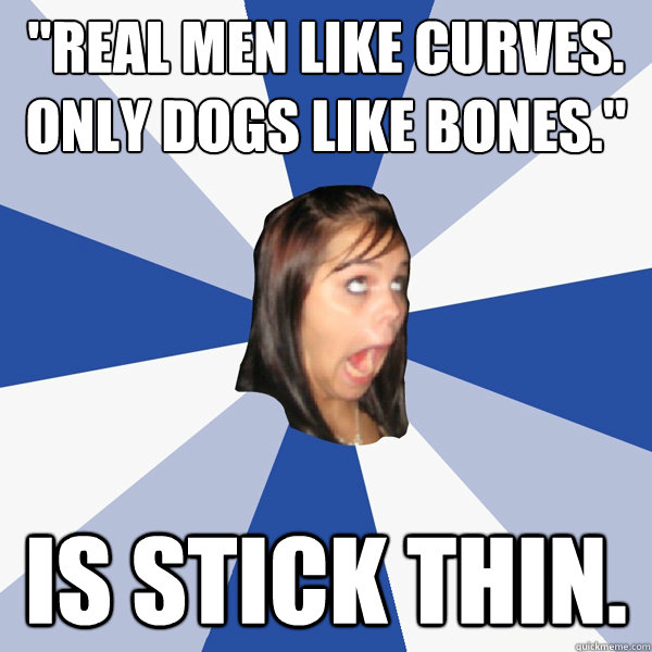 "Real men like curves. Only dogs like bones." Is stick thin.