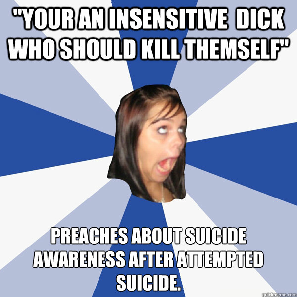 "Your an insensitive dick who should kill themself" preaches about suicide awareness after attempted suicide.