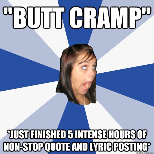 "Butt Cramp" *just finished 5 intense hours of non-stop quote and lyric posting*
