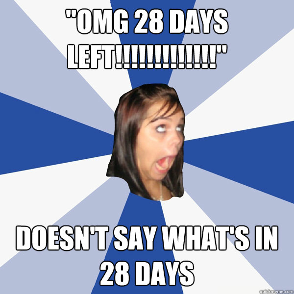 "omg 28 days left!!!!!!!!!!!!!" doesn't say what's in 28 days