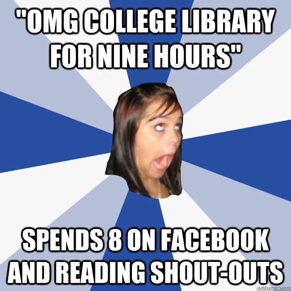 "OMG college library for nine hours" spends 8 on facebook and reading shout-outs