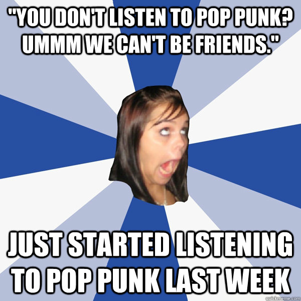 "you don't listen to pop punk? ummm we can't be friends." just started listening to pop punk last week