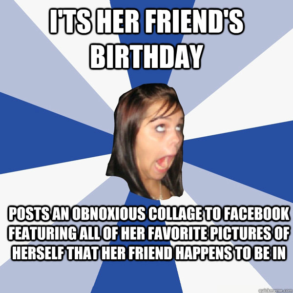 I'ts her friend's birthday posts an obnoxious collage to facebook featuring all of her favorite pictures of herself that her friend happens to be in