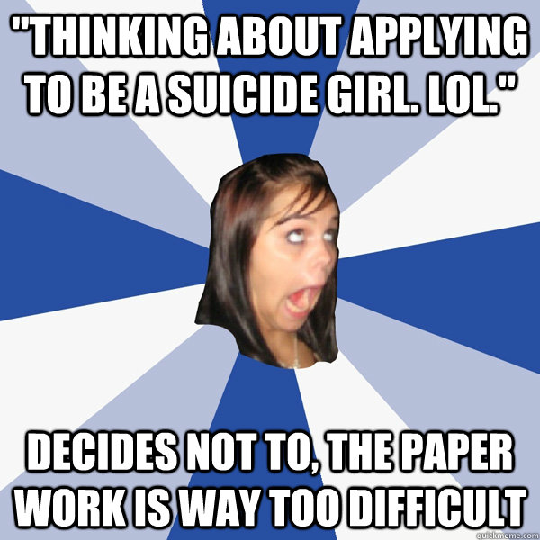"Thinking about applying to be a suicide girl. lol." Decides not to, the paper work is way too difficult