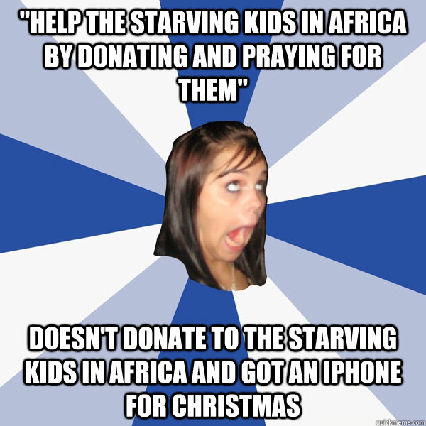 "help the starving kids in africa by donating and praying for them" doesn't donate to the starving kids in africa and got an iphone for christmas