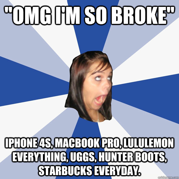 "omg i'm so broke" iphone 4s, macbook pro, lululemon everything, uggs, hunter boots, starbucks everyday.