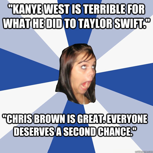 "Kanye West is terrible for what he did to Taylor Swift." "Chris Brown is great. Everyone deserves a second chance."