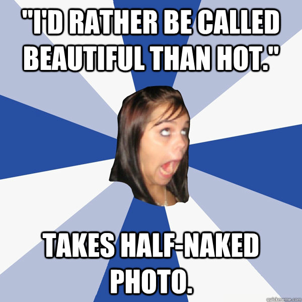 "I'd rather be called beautiful than hot." Takes half-naked photo.