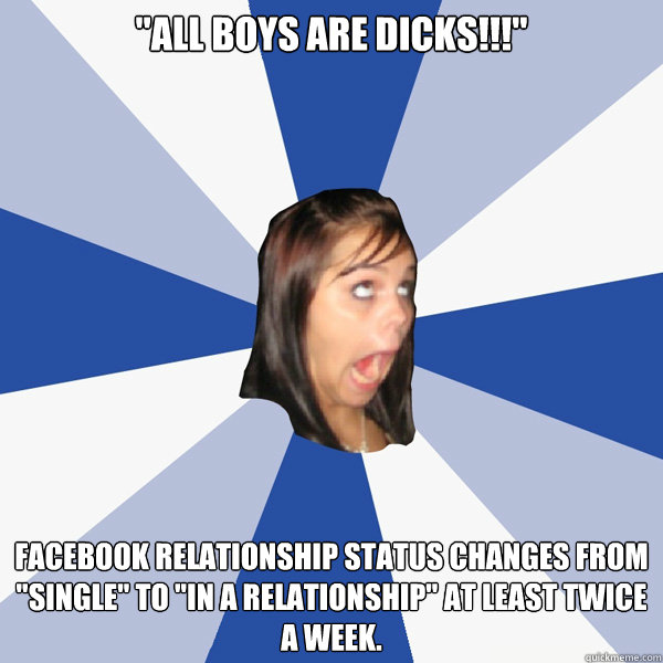 "All boys are dicks!!!" Facebook relationship status changes from "single" to "in a relationship" at least twice a week.