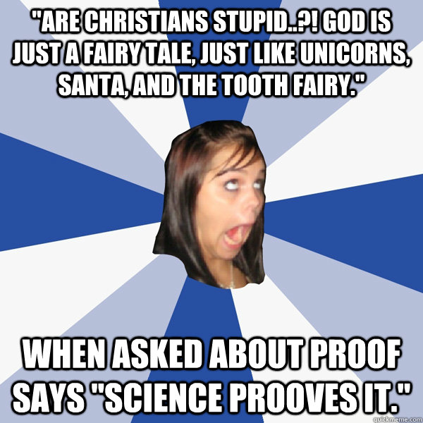 "Are christians stupid..?! God is just a fairy tale, just like unicorns, santa, and the tooth fairy." When asked about proof says "science prooves it."