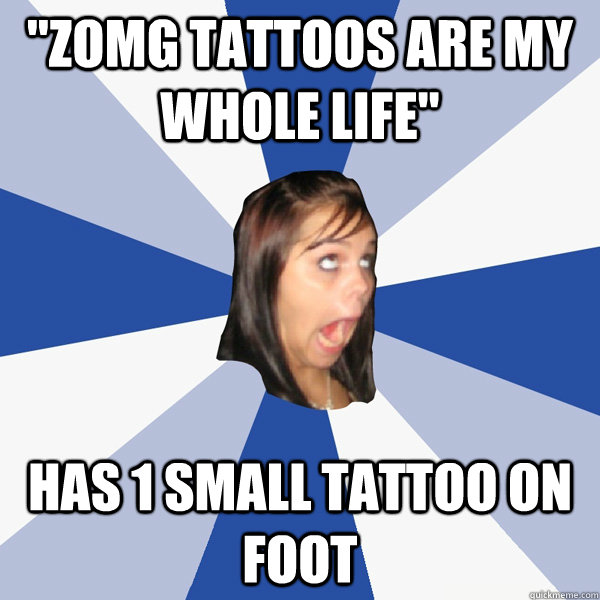"zomg tattoos are my whole life" Has 1 small tattoo on foot