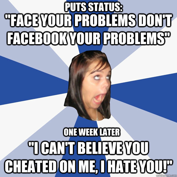 "Face your problems don't facebook your problems" "I can't believe you cheated on me, I hate you!" One week later Puts status: