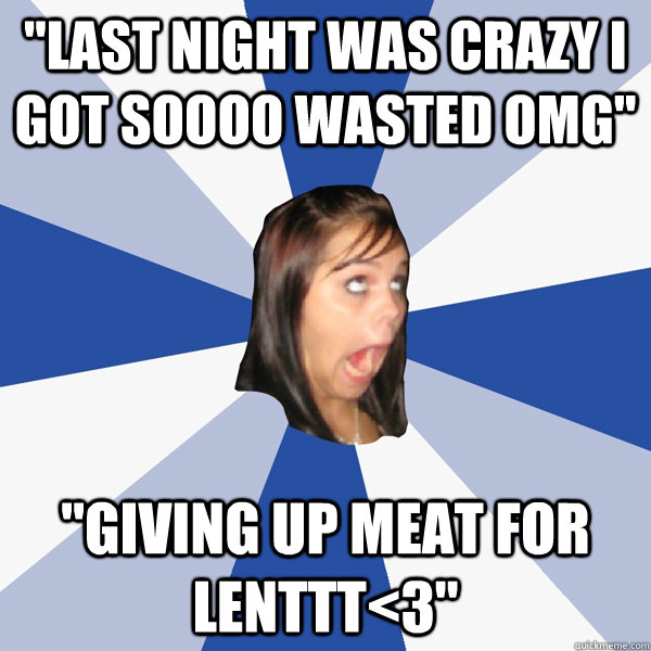 "last night was crazy i got soooo wasted omg" "giving up meat for lenttt<3"