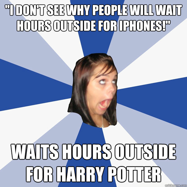 "I don't see why people will wait hours outside for iphones!" waits hours outside for harry potter