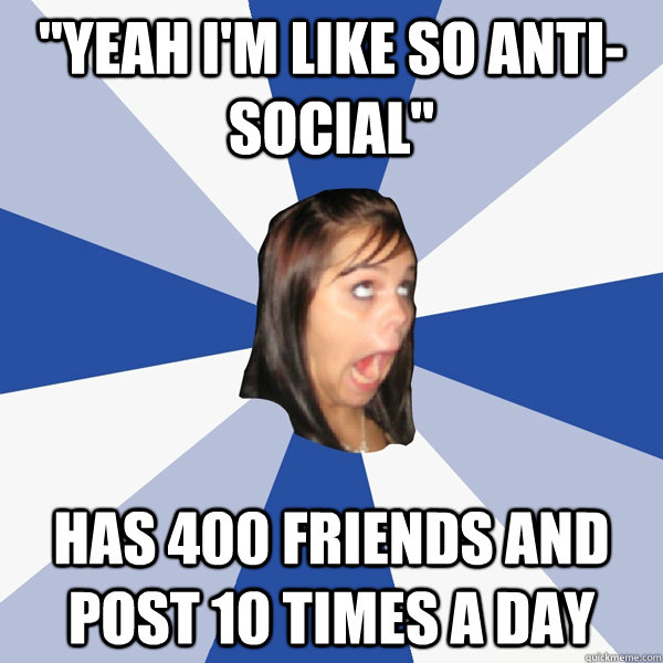 "Yeah i'm like so anti-social" Has 400 friends and post 10 times a day