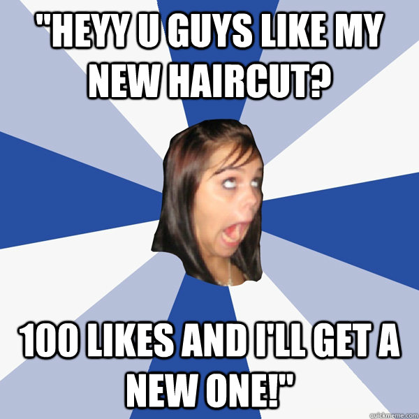 "Heyy u guys like my new haircut? 100 likes and i'll get a new one!"