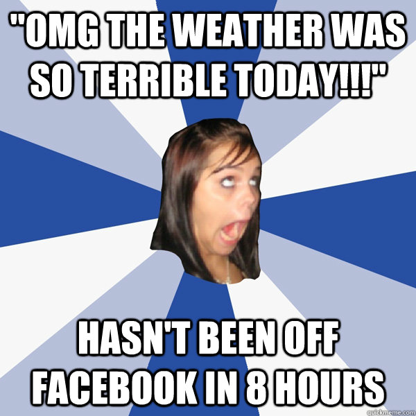"OMG the weather was SO TERRIBLE today!!!" hasn't been off facebook in 8 hours