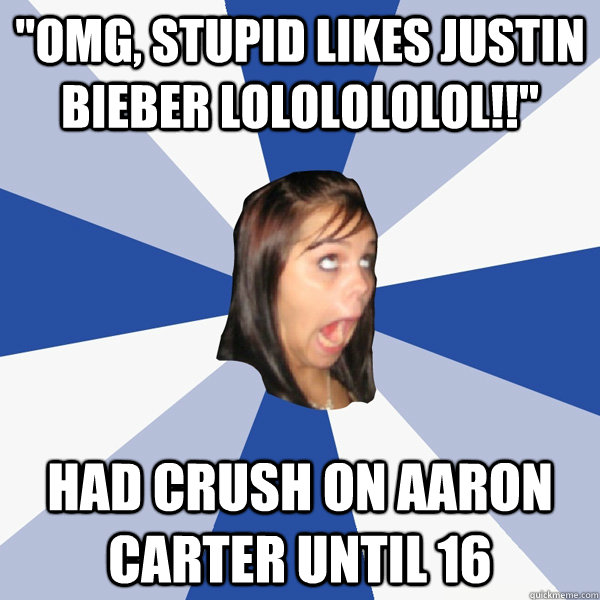 "omg, stupid likes justin bieber lololololol!!" had crush on aaron carter until 16