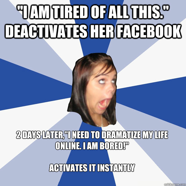 "I am tired of all this." Deactivates her facebook 2 days later,"I need to dramatize my life online. I am bored!" ACTIVATES IT Instantly