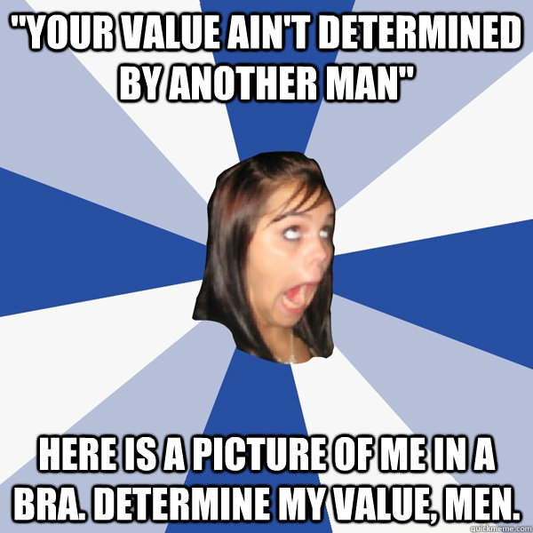 "YOUR VALUE AIN'T DETERMINED BY ANOTHER MAN" HERE IS A PICTURE OF ME IN A BRA. DETERMINE MY VALUE, MEN.