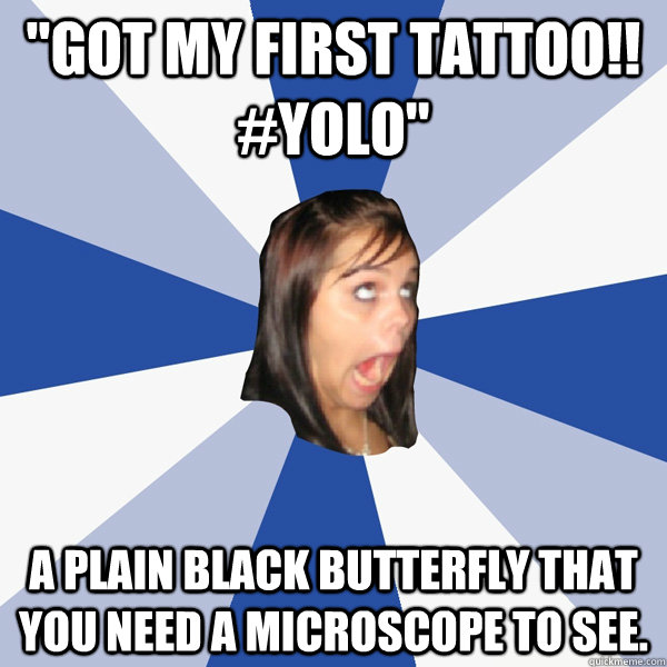 "Got my first tattoo!! #YOLO" A plain black butterfly that you need a microscope to see.