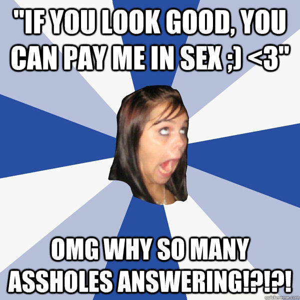 "If you look good, you can pay me in sex ;) <3" OMG Why so many assholes answering!?!?!