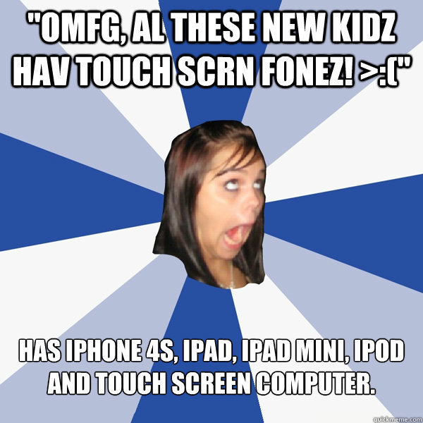 "omfg, al these new kidz hav touch scrn fonez! >:(" Has iphone 4s, ipad, ipad mini, ipod and touch screen computer.