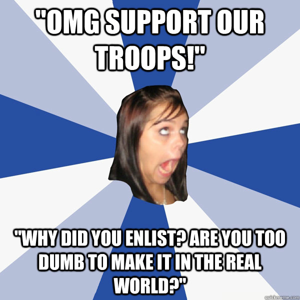 "OMG Support our troops!" "Why did you enlist? Are you too dumb to make it in the real world?"