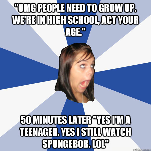 "omg people need to grow up. We're in high school, act your age." 50 minutes later "Yes I'm a teenager. Yes I still watch spongebob. LOL"